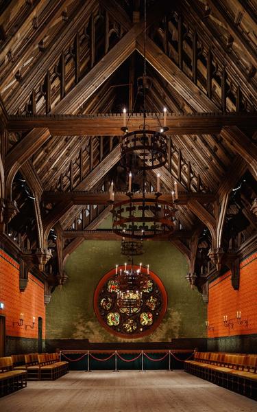 - Hallen har lenge fremstått mørk og kald. Den flotte takkonstruksjonen i tre og det middelalderske monumentale mønster på veggene fra 1300-tallet med de malte draperiene nederst har kommet lite til sin rett. Det var håndverket, konstruksjonene og ornamentene i taket og den røde fargen og gullornamentene fra veggene vi gjerne ville få bedre frem for å skape en vakker og varm stemning - sier styremedlem Peter S. Gulbrandsen i venneforeningen.